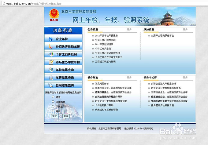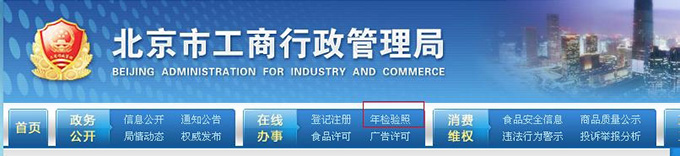 第一步:进入主页 1.打开浏览器,输入网址: http://www.hd315.gov.cn/ 进入“工商局网站”,这里以"北京工商局网站"为例进行讲解.选择“年检验照”,进入网上年检申报系统主页面,选择"在线办理"
