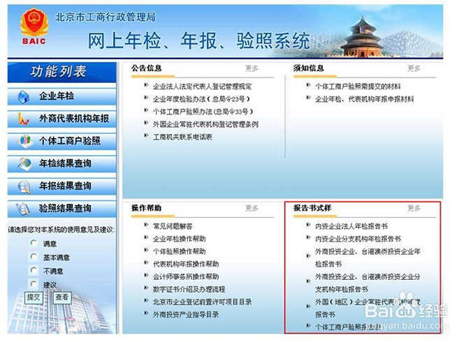 第二步:进入登录页面 点击主页面左侧的“企业年检”按钮,进入企业年检用户登录页面。 如何下载纸制报告书? 在网上年检验照系统首页面“报告书式样”栏目下,用户根据自己的企业类型,点击对应报告书,即可下 载空白的年度报告书文档,如下图所示: