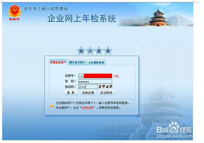 企业申报年检报告书? 只有已注册的用户才可登录系统,用户登录有两种方式: 第一种:在注册完成后,点击“登录”按钮,直接登录系统。 第二种:在系统登录页面中,输入正确的用户名和密码,然后点击“登录”按钮,进入系统.
