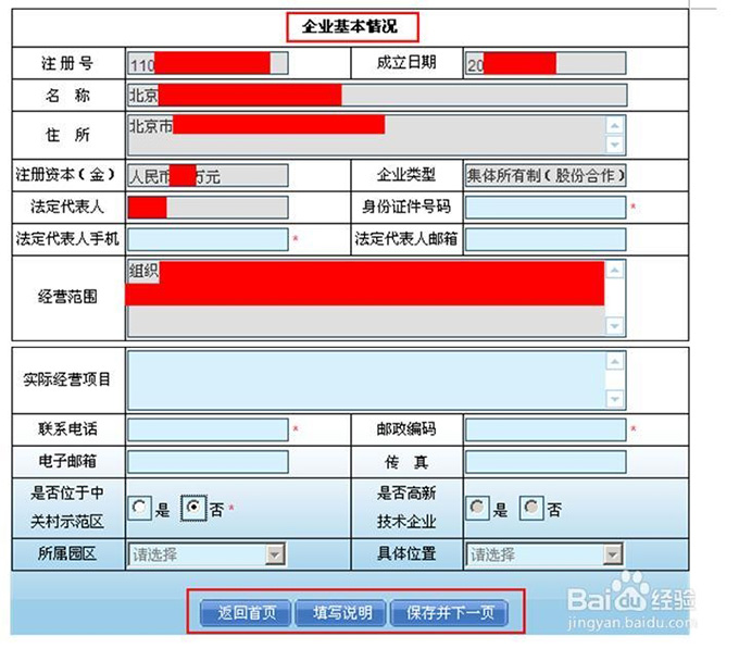 第一步:填写企业基本情况 进入申报年检数据页面后,有一部分信息是从系统中自动获取的,登录用户不可以修改。 用户可在此页面中输入企业的其他基本信息,如有效证据号码、法人代表手机、法定代表人邮箱、实际经 营项目、联系电话、邮政编码、电子邮箱、传真、是否位于中关村示范区、是否高新技术企业、所属园区 等信息 用户录入完成后,点击“下一步”按钮,进入第二页“经营情况”页面 提示: 页面中标注“*”的为必填项。 其中:法定代表人邮箱为非必填项目,格式必须符合邮箱的格式“XX@XX.Com” 。 联系电话为必填项目 邮政编码必须为6位。 第二步:填写企业经营情况
