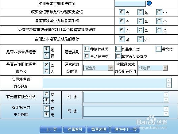 在此页面如实的录入企业的经营信息,如资产、负债、利润、收入、从业人员、企业状况、经营类型、 地址、有无自由独立网站、有无第三方平台网店等信息。 提示:有关填写规则如下: 如使用新会计准则,表中长期投资:指可供出售金融资产、持有到时期投资及长期股权投资三项之和。 纳税额包含以下税种:增值税、消费税、企业所得税(个人独资及合伙企业为个人所得税)、营业税、 房产税(城市房地产税)、城镇土地使用税、土地增值税、关税等。 从业人员总数:指在本企业工作并取得劳动报酬的全部人员。其中城镇居民人数:指具有城镇居民户口 的从业人员总数;安置本市大学生数:指从业人员中具有大学专科以上学历人员总数;安置本市城镇失 业人员数:指在本企业工作,拥有《再就业优惠证书》的职工人数。外埠人员总数:指在本企业工作, 并由企业支付劳动报酬的外省人员总数。其中外埠城镇居民人数:指具有外埠城镇居民户口的从业人员 总数。 是否经营,如果选择为“否”:在“筹建”、“无经营项目”、“清算”、“无经营场所”四项中选择 一项。 改变登记事项是否办理变更登记、备案事项是否办理备案手续、经营专项审批或许可的项目是否取得审 批或许可:选择“无”、“是”或“否”。例如,如果没有发生“改变登记事项”的行为,选择“无” ,有过有,并且办理了变更登记的,选择“是”,没有做变更登记的选择“否”。本年度未发生登记事 项、备案事项变更或无专项审批的,选择“无”。注册资本是否按期足额缴付:选择“是”或“否”。 是否从事食品经营:选择“是”或“否”。如选择“是”,经营类别要具体选择;如选择“否”,经营 类别不必选择。 是否在住所办公或经营:根据实际情况填报“是”或“否”。如选择“是”,经营或办公时限、实际经 营或办公所在区县、实际经营或办公地址不用填报;如选择“否”,上述三项根据实际情况填报。 有无自由独立网站、有无第三方平台网店,如选择“有”,在网址栏填写网址。 在填写具体数字时,要确保负债总额应 大于等于 长期负债 或 非流动负债; 利润总额应 大于等于 净利润 全年销售收入应 大于 等于服务营业收入 从业人员数应该 大于等于 城镇居民人数 从业人员数应该 大于等于 安置本市大学生数 从业人员数应该 大于等于安置本市城镇失业人员数 从业人员数应该 大于等于外埠人员总数 外埠人员应该大于等于其中城镇居民人数! 第三步:外埠出资者出资情况