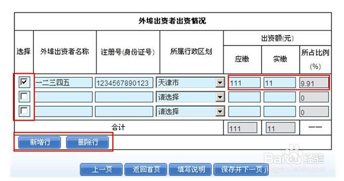 用户可输入外埠出资者名称、注册号、所属行政区划、出资额等信息,如下图中所示 系统默认用户可输入三行外埠出资者出资情况信息,若需要添加更多的信息, 点击“新增行”按钮,即可输入更多信息。若需要删除某行信息,用户选中“选择”列前的选框框,然后 点击“删除行”按钮,即可将所选行删除。 用户输入完成后点击“下一步”按钮。 提示:用户在出资额列中输入应缴、实缴数据后,用鼠标点击所占比例输入框,系统会自动算出其所占比例。 指法定住所(住址)不在北京的有限责任公司股东、股份有限公司发起人、非公司制企业出资人、个人独资企业 投资人、合伙企业合伙人的法人名称或自然人姓名。注册号(身份证号):外埠出资者是法人的,填报其营业执 照注册号或其它法人登记证书号;外埠出资者是自然人的,填报其身份证号。所属行政区划:指外埠出资者所在 省份(直辖市)名称。应缴:指外埠出资者应当缴纳的认缴出资额。实缴:指外埠出资者至年检时止实际缴纳的 认缴出资额。所占比例:指实缴额占应缴额的百分比。 第四步:录入对外投资情况信息