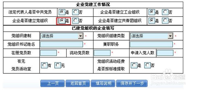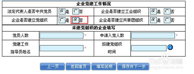 录入后点击“下一步”按钮。 第五步:录入非公有制企业党建工作情况年报表 录入真实的非公有制企业党建工作情况年报表。 企业是否建立党组织,选择“是”: